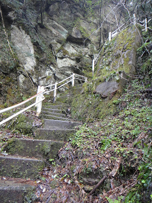 Eventually we arrived at the major scenic viewpoint (though we'd been following the gorge for some time), and there were even signs, which we were beginning to doubt. And a parking lot and a campground (not open yet) and various buildings for the campground that weren't open yet either. To reach the main attraction, a fair-sized waterfall, a fairly crazy staircase had to be navigated. In a more litigious country, this staircase probably may have been deemed unsafe. We made it down fine though, as did some women in other groups with much less sensible footwear.